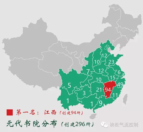 另外,对于书院的发展而言,元代的最大贡献,是将书院和理学一起推广到北方地区,缩短了南北文化差距。这从如下各省新建书院分布图(分布在如今19个省区)可以得知: