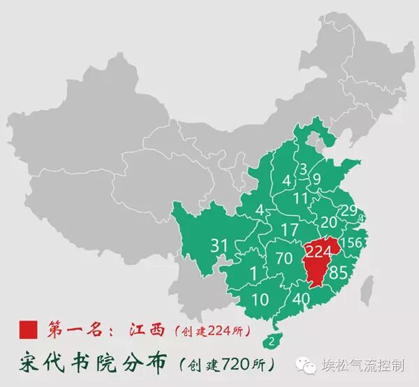 宋代开创了书院历史的新纪元。北宋时,书院作为学校的一种得到社会认同,并使学术与书院的一体化得以完成。南宋时,书院作为一种文化教育制度得以完全确立,标志着我国教育事业进入官学、书院、私学三轨并行的时代。两宋共兴建书院720所,分布在如今19个省区: