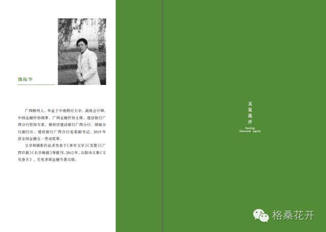 首页 | 美容百科 | 高原读书:《又见花开》 高原读书:《又见花开》 2023-04-19 23:50:29 书名:《又见花开》 著作者:魏振华 出版社: 版次:第1版 (2016年10月1日) 语种: 简体中文 开本: 16又见花开纯美散文集。因为不抛弃,所以美丽;因为坚守,所以幸福。名家推荐时代的发展告诉人们,越是跨界的人士或许越能具备独特的人格魅力,显示出更广博的文化修养,他的此部散文集《又见花开》便是多种心得的结集。从小成长于逆境未尝不是一件好事,积极的人在每一次忧患中都会看到机会,并且成就自我。魏振华就是这样一步步走过来的,他以自己的经历撰文,催人励志,引人向上,以对生活和世界的善意给人以温暖的力量。——中国作协主席团委员、著名作家 叶梅内容提要本书为散文集。收录了作者数十篇散文,这些散文或记录家事国事,或表达对社会人情的理解,或抒发对山川风物的咏叹,文笔优美清新,情感亦摇曳多姿:早年生活的深沉回味,尘世跌宕后的厚积薄发,游历山川时的灵性摭拾,齐涌至多彩的笔端,凝作睿智的盛筵。对生活的热爱,对生命的咀嚼,对亲情、友谊的珍惜,在感性而细腻的心田汇成诗流,萃聚于字里行间。作者简介魏振华,广西柳州人。毕业于中南财经大学,高级会计师。中国金融作协理事、广西金融作协主席。建设银行广西分行资深专家,曾担任建设银行广西分行、湖南分行副行长、建设银行广西分行党委副书记。湖南大学、广西财经学院、广西外国语学院兼职教授。2015年获全国金融五一劳动奖章。文学和摄影作品多发表于《青年文学》《芙蓉》《广西日报》《长沙晚报》等报刊。另有多部金融专著出版。2012年,出版散文集《又见春天》(中国青年出版社出版)。版式设计目 录 辑一 眼底尽收天下景秋行边界秋日思语芭芒花秋行延安又回长沙依恋橘子洲又见雪飘回头看更美 辑二 胸中常怀家国事母亲怀念母亲回忆父亲旧门上的时光消失的母校因有比赛而精彩缅怀身边的英雄心在人民,利归天下 辑三 笔下绽开万千情秋的记忆迷途之盼放弃也很美我心中的《瓦尔登湖》我走在秋天里让压力释放美丽乡村年趣让雷锋精神永放光芒 附录:自信 执着 弄潮精彩内容明日开始每日推出!敬请关注!编辑:周可