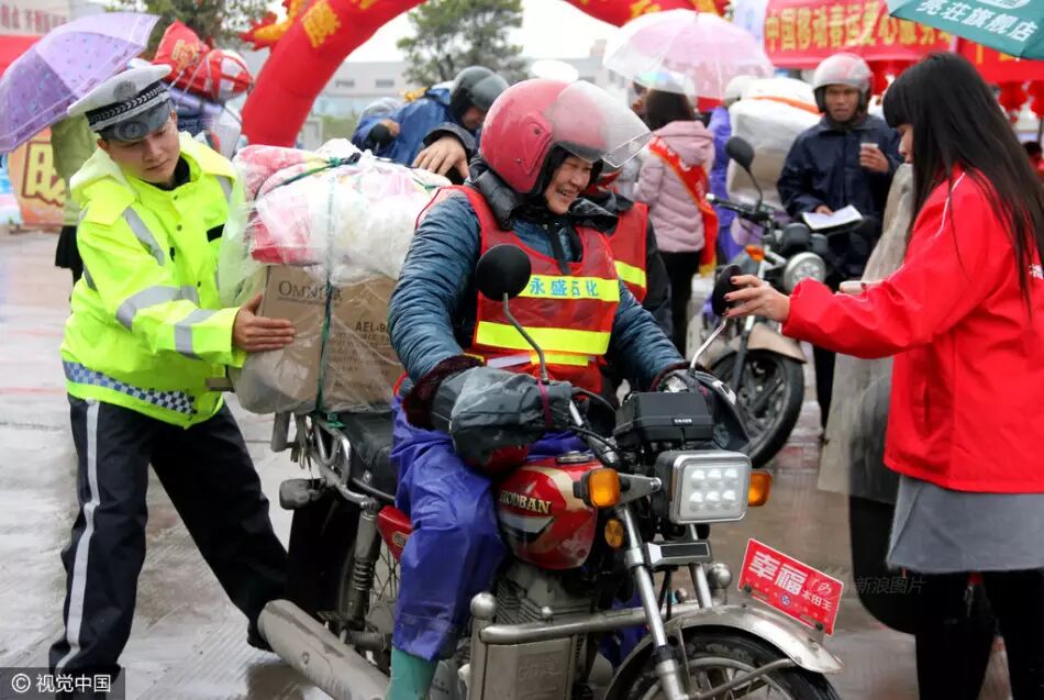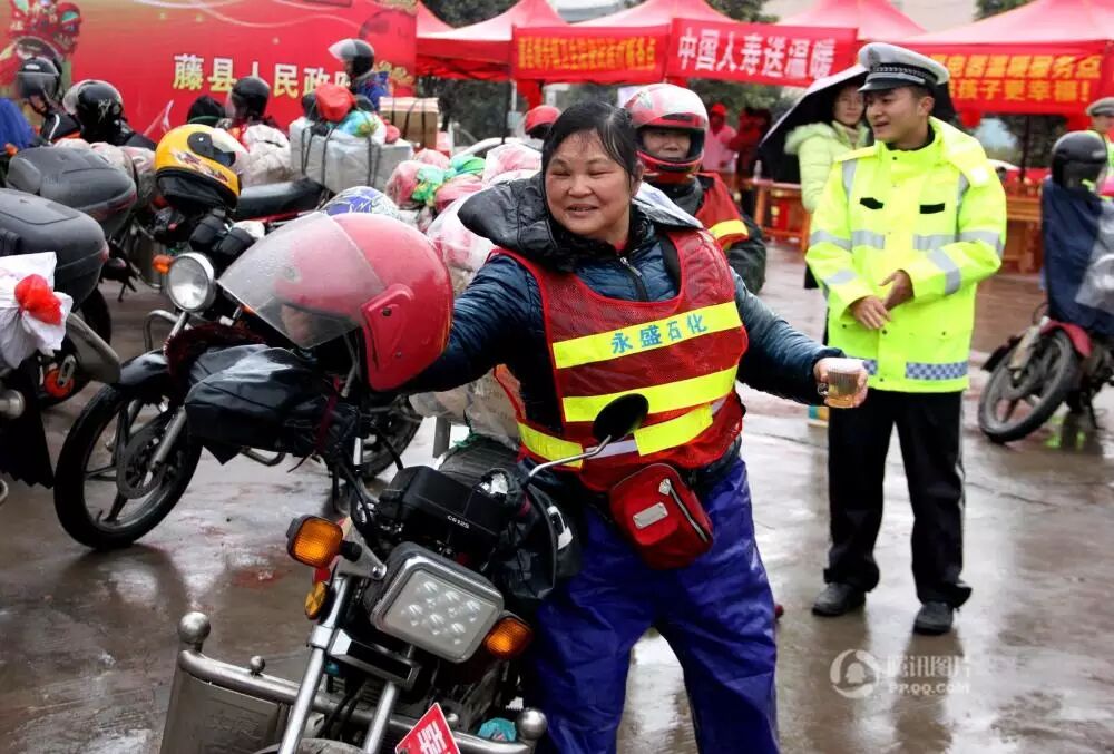 2017年1月16日,在粤桂交界的广西梧州市藤县春运服务站,在长途跋涉的“铁骑大军”中,一些“女汉子”显得特别显眼。