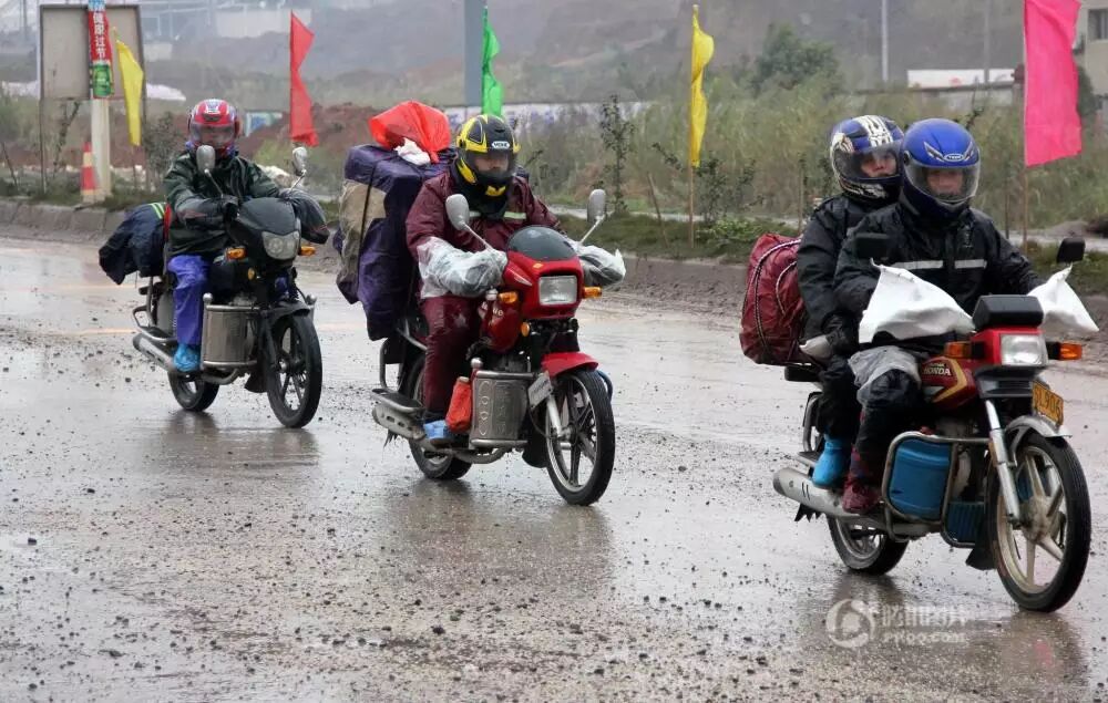 临近春节,数十万名农民工在广东珠三角地区骑摩托车,途经广西贺州、梧州、玉林等地,返回广西、湖南、贵州和云南过年。