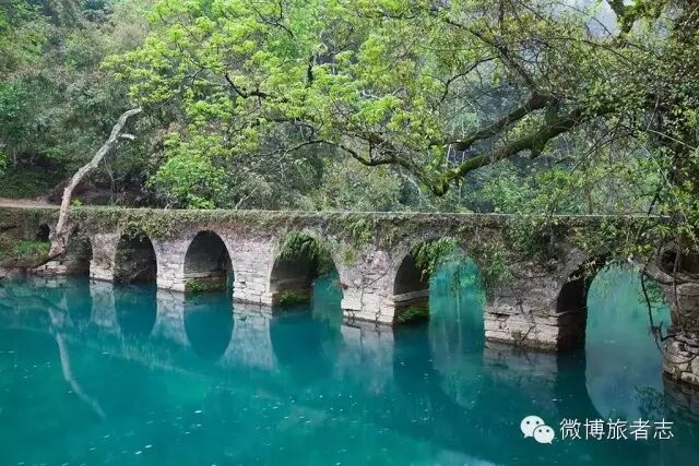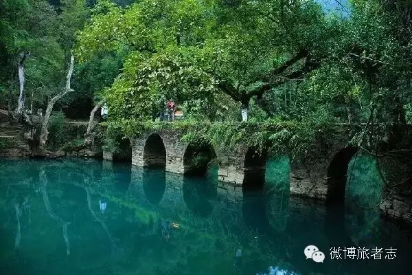 小七孔指的是一座七孔桥,它在古代是贵州和广西的交界处。走过小七孔桥,你便脚踏两省了。小七孔的景点都是沿山路分布的,最好的游览方法便是坐着当地农民赶着的驴车漫步其中。一路上,一侧是山,一侧是水,时而能看到参天的大树倒栽葱地倒在水里。树的根部已经枯死,而泡在水中的枝干却有的发芽并长出了绿色的枝叶,横漂在水中。