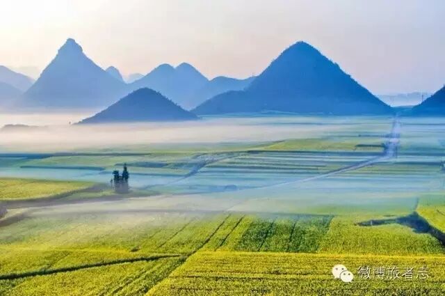春季罗平油菜花在盛开,铺满群山旷野;小鸟儿在歌唱,蜜蜂在花丛中徘徊。醉卧花丛中,让心旌飞扬,任思绪随着蓝天白云绽开。此刻元阳的梯田注满琼浆,正迎着朝霞放射着异彩;飘荡在云中雾里的田基线如舞动着的琴谱,掩影在桃花丛中的村落仿似天上人间。