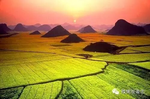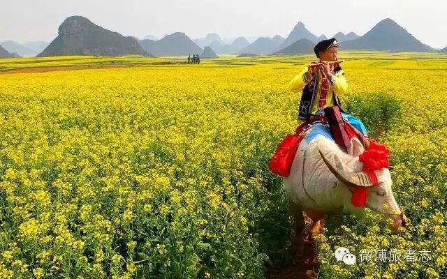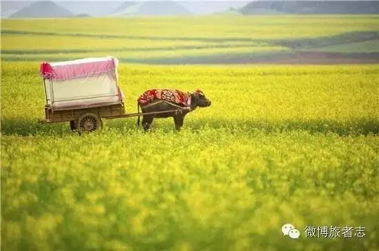 浩荡珠江的源头,磅礴乌蒙的南麓,滇、桂、黔三省(区)结合部,有一块曾令明代大旅行家徐霞客为之亢奋并驻足停留连数十天之久的神奇而美丽的土地──罗平。20万亩菜花把罗平的山川大地装点得一片金黄,罗平坝子里十五万亩连片油菜形成了世界最大的花园,辽阔无边。,是喀斯特岩溶的一种典型地貌,这种另类的田园风光,也是罗平一个引人注目的焦点。步入花的海洋,成群结队的蜜蜂飞满头顶的天空和周围的世界,它们是那些追蜂逐蜜的养蜂人从全国各地带来的。养蜂者,这些中国唯一流浪春天的吉卜赛人,安营扎寨油菜花中,风餐露宿,为金色的花海添置了另一道风景。