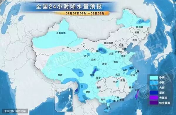 从昨天开始,强降雨中心开始转至长江上游,四川盆地将遭持续性暴雨。,7月7日至9日,四川盆地部分地区将出现持续性较强降雨,累积降雨量有50~80毫米,其中,盆地西北部部分地区降雨量可达100~200毫米。