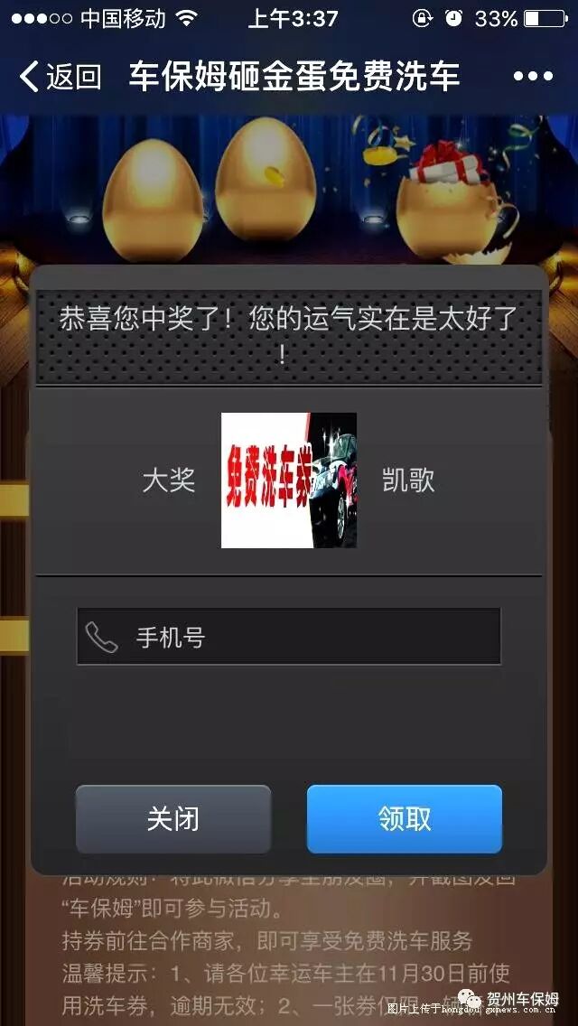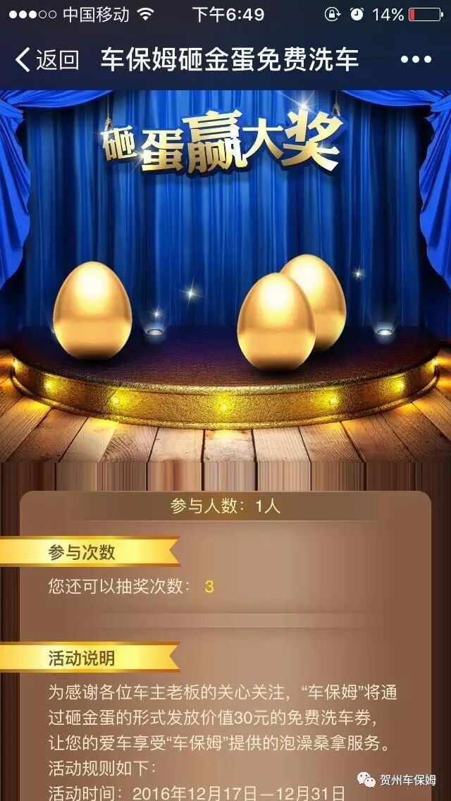 2、手机键盘 回复“免费洗车”点击活动链接页面, 即可参与砸金蛋免费洗车活动。