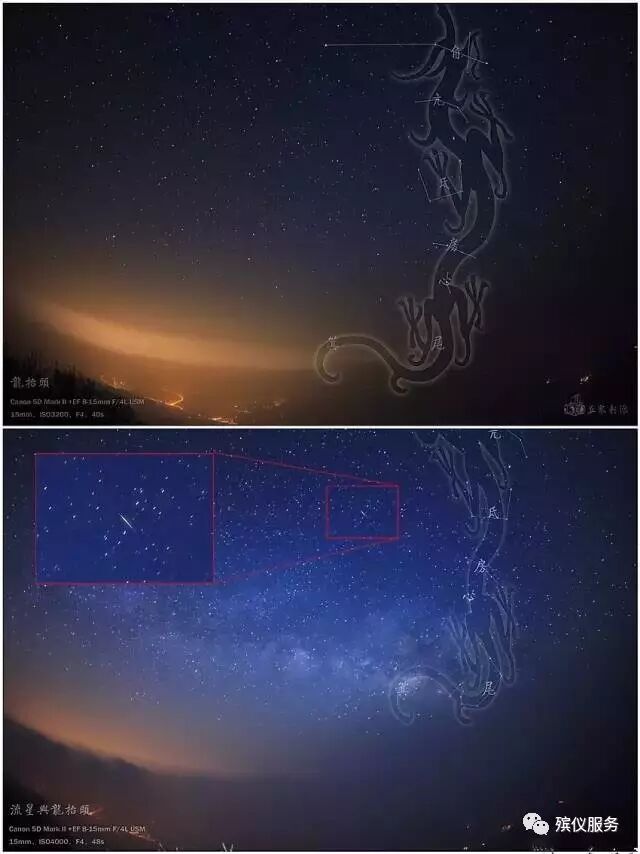 苍龙头部“角宿”上有两颗星:角宿一和角宿二,代表苍龙头上的两只犄角。“角宿” 之后的四颗星是“亢宿”,亢是龙的咽喉,在咽喉下面有四颗星排列成一个簸箕的形状是“氐宿”,代表着龙爪。龙爪后面的房宿、心宿、尾宿和箕宿分别代表了龙的心脏和尾巴。