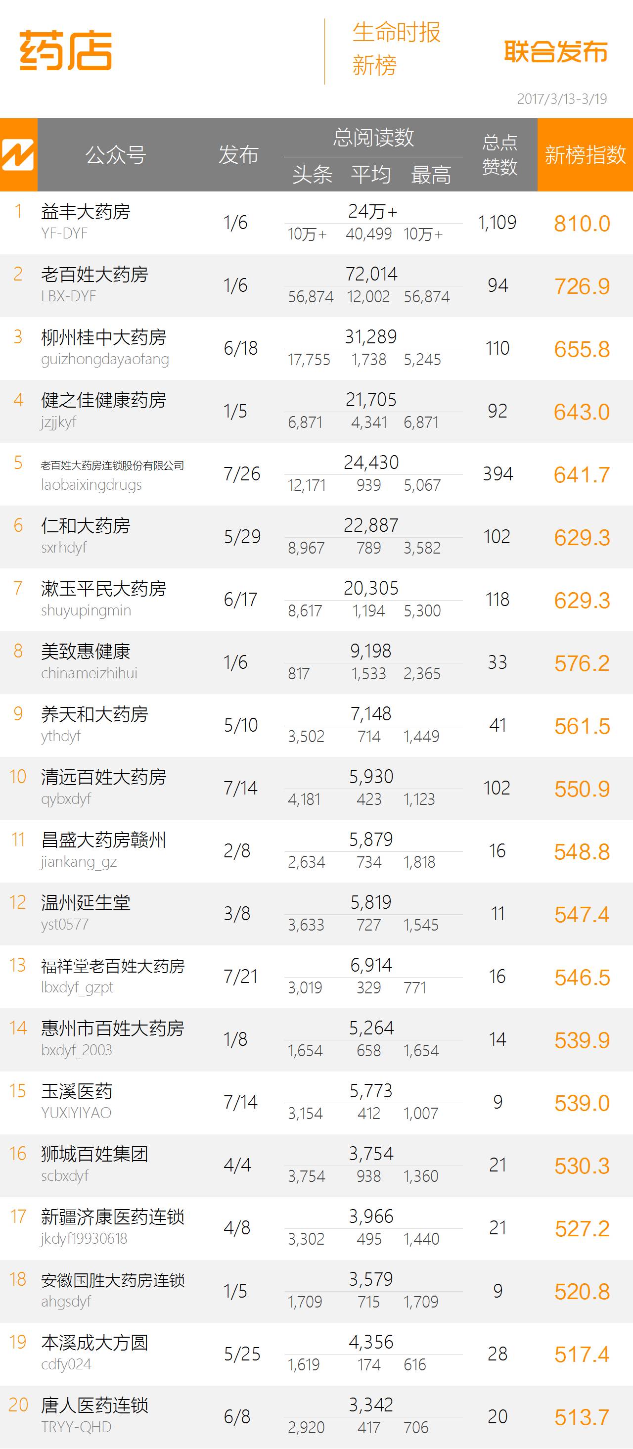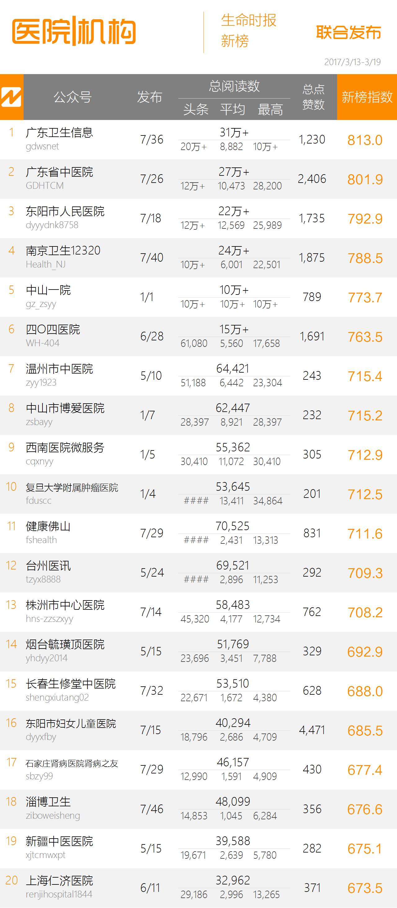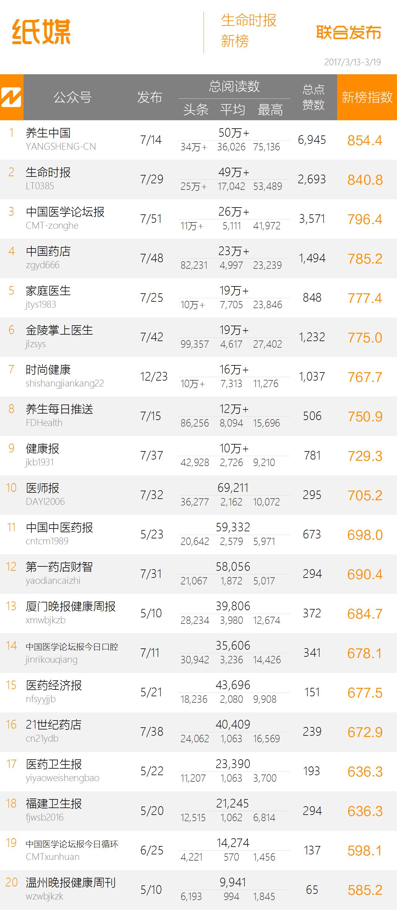为满足不同人群对健康信息的多元需求,辅助管理者、发布者、读者等各方进行甄别,自2015年1月起,生命时报与新榜每周联合发布“中国健康类微信影响力排行榜”。