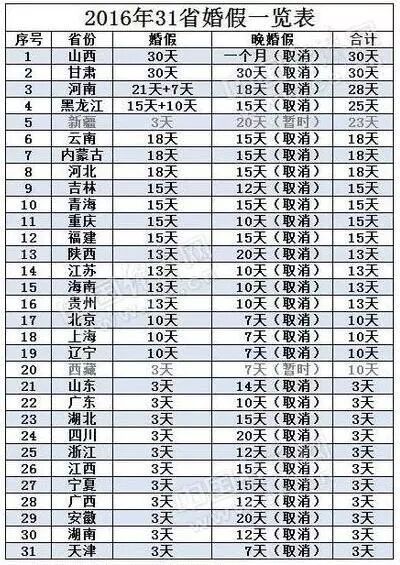 首页 | 美容百科 | 2016年31省份最新婚假出炉:最长30天 上海为10天 2016年31省份最新婚假出炉:最长30天 上海为10天 2023-04-19 23:50:29 点击上方“上海学习网” 可以订阅哦!据统计,除了新疆和西藏还未对本地区的计生条例进行修改外,其余29个省份均已对该条例进行了调整。(来源:中国经济网)29省晚婚假取消已坐实,粤湘等11省婚假仅为3天。2015年12月27日,全国人大常委会审议通过了修订后的《人口与计划生育法》,新计生法删掉了有关鼓励晚婚晚育的规定,提倡符合法理法规规定生育的,可以享有延长生育假的相关奖励,及其其他相关的社会福利。今年,各省关于“晚婚假”的存废也已经尘埃落定。各地对原有的婚假、产假以及陪产假(即男士的护理假)均做出了相关的修改,从目前出台的规定来看,大多数省份的婚假都是在取消晚婚晚育、规定延长生育假的大原则之下,绝大多数省份的婚假天数是与国家法律规定保持一致的。目前29个省取消了原有的晚婚假,其中有11个省份删除了相关晚婚假的条例,并没有对婚假再做另外的相关规定,那么这些省份婚假将与国家法律规定保持一致,仅有三天法定婚假。这些省份包括广东、湖北、四川、浙江、江西、宁夏、广西、安徽、湖南、天津、山东。山西、甘肃保留30天豪华婚假,黑豫陕增加超长婚检假。2016年年初山西省公布了最新修订的《山西省人口和计划生育条例》,从1月起山西省依法办理结婚登记的夫妻可享受婚假30日。在还未修改该条例以前,山西就是全国婚假最长的省份,拥有一个月的超长婚假,如今最新的计生条例只是删除了“晚婚、晚育、少生”的相关条款,却在修正后的《条例》中规定依法办理结婚登记的夫妻可以享受婚假30日。从表格中可以看到,除了山西以外,甘肃地区也保留了30天的婚假,与山西并列第一。另外,小编特别关注了河南省与黑龙江省,两个省份在修改本省的计生条例时对婚假的规定增加了对于参加婚前医学检查的夫妻增加婚假7天和10天的规定,使得河南省和黑龙江省婚假天数仅次于山西和甘肃。据统计,河南可休28天,黑龙江婚假可以休25天。除了河南和黑龙江,陕西省也在法定3天婚假的基础上增加了10天的婚检假。增加婚检假,目的是鼓励大家去参加婚检,进而降低缺陷人口出生率。提醒有结婚准备的青年男女注意的是,如果河南、黑龙江、陕西三地的青年男女想休婚检假的话,需要在结婚之前去户口所在地的妇幼保健机构进行婚检,然后拿婚检报告去和单位请假,不然将无法享受增加的婚检假期。多省原有婚假天数增加,再婚夫妻多可享受同等婚假。除了仅保留3天法定婚假的11个省份外,其它省份均在3天法定婚假以外增加了婚假天数,增加后婚假天数在10到18天不等。其中北京、上海、辽宁的婚假天数相对较少,为10天。增加婚假天数的省份大多在计生条例中规定再婚夫妻与初婚夫妻享受同等的婚假待遇。另外,值得注意的是,婚假和户口并无关系,只与工作地有关。举例来说,如果山西人在北京上班,那他的婚假也只能按照北京10天的规定来执行,不能享受山西30天的超长假期。↓↓↓详情请戳 【阅读原文】