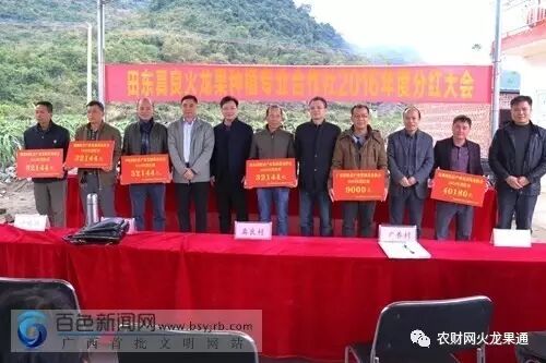 1月17日,寒意袭人,但广西百色市田东县思林镇真良村火龙果种植专业合作社里却暖意融融。当天,该合作社正在举行2016年度分红大会,来自田东县思林镇、作登瑶族乡5个贫困村的贫困户代表喜领177756元的入股分红。