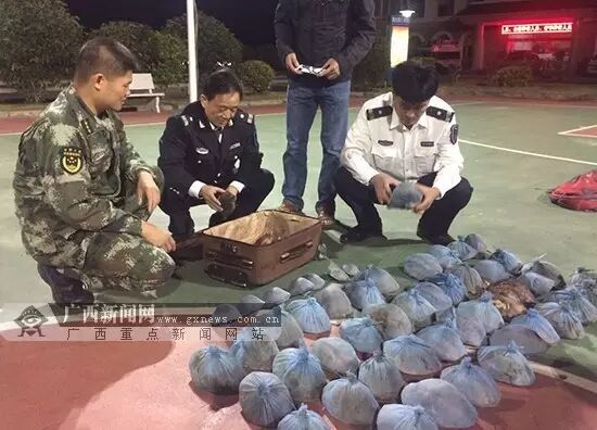 11月13日傍晚9时左右,宁明县寨安边检站例行检查时发现,在一辆从爱店镇开往宁明县城方向的出租车上,有人携带疑似野生动物运往城区。随后,检查站人员将该车拦截,立即通知宁明县水产畜牧兽医局。该局执法人员迅速赶往现场,从车后厢的麻袋中查获46只黄额闭头龟,10只黄额闭头龟龟苗,锯缘摄龟3只,齿缘摄龟1只。