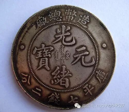 光绪元宝简介,光绪元宝历史:银币光绪元宝1898年发行,成色为91%。正面铸有铭文,顶部铸楷体“XX省造”或“造币总厂”,底部铸“库平七钱二分”,中心直读“光绪元宝”四字,币中心为满文“光绪元宝”。银币背面外圈顶部用小号英文标准字体铭“XX省造”或“造币总厂”字样,下面为英文“库平七钱二分”,内圈铸有中心为蟠龙图,品相精致,其审美风格独持,钱币正面鲜然可见满汉文化的融合,而钱背却明确标示了西方文化的介入。钱币虽小,也可管窥社会文化一斑。