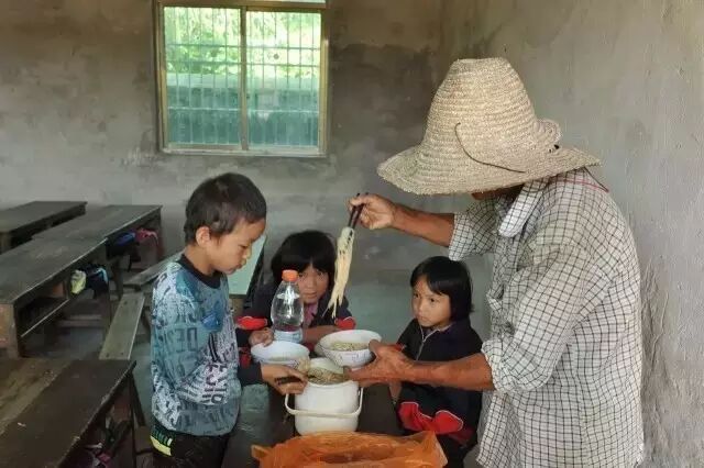 这位爷爷给三个孙子孙女带来的是清水煮面,这就是孩子们的午餐。