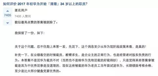 前一段时间,一篇题为《我那么努力,到底哪里出了问题?》的帖子同样在网络上疯传,作者自称是“深圳某知名通讯公司”的员工,因考虑到家庭情况不愿意出国,而被HR劝退。这篇文章中提到的情况,和此前曝出的“华为清退34岁以上员工”的新闻不谋而合。