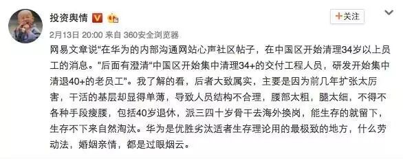 自称观察华为多年,并在华为工作多年的微博大V@投资舆情认为,“我了解的看,主要是因为前几年扩张太厉害,干活的基层却显得单薄,导致人员结构不合理,腰部太粗,腿太细,不得不各种手段瘦腰,包括40岁退休,派三四十岁骨干去海外换岗,能生存的就留下,生存不下来自然淘汰。华为是优胜劣汰适者生存理论用的最极致的地方,什么劳动法,婚姻亲情,都是过眼烟云。”