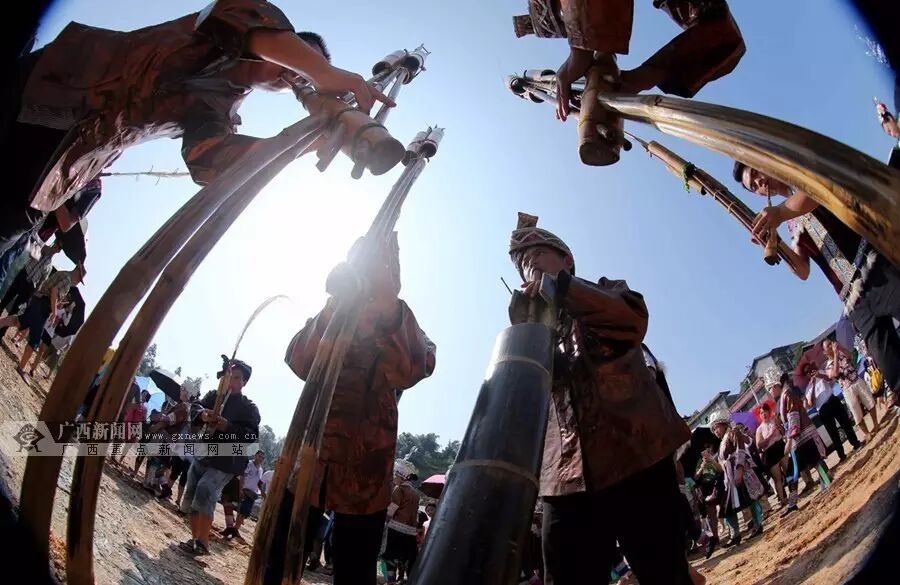 当地苗族群众和当地壮族、侗族等民族同胞一起吹奏芦笙、跳踩堂舞。
