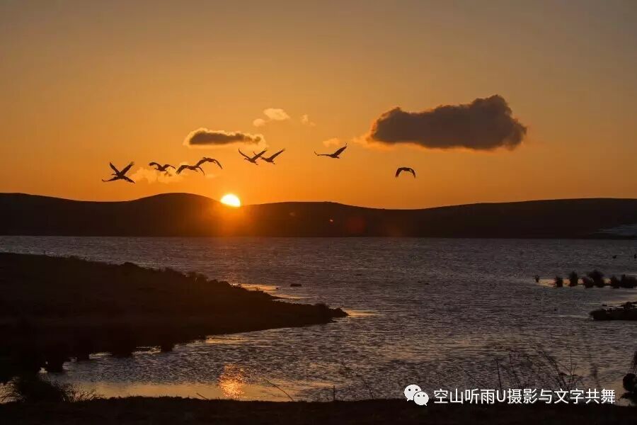 天不亮到达大山包的这个小湖泊是为了拍黑颈鹤,不料却拍出了这张日出照片。天上飞过的就是黑颈鹤,但在图上它们只是剪影,是鸟儿的符号。有时候特意要的未必能得到,无意的却可能是最好的收获。