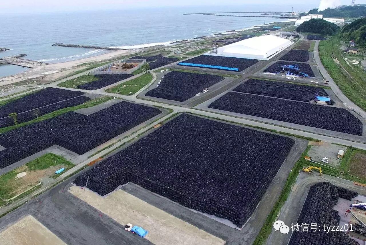日本福岛双叶郡地面上整整齐齐摆放好的装着被污染过的土壤的数不清的黑色的袋子。