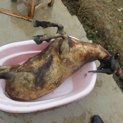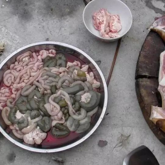 然后把羊肠等内脏取出来。其中黄绿色的肠子就是主角:羊瘪肠,里面是青草在肠内经过酵母发酵以后的产物……