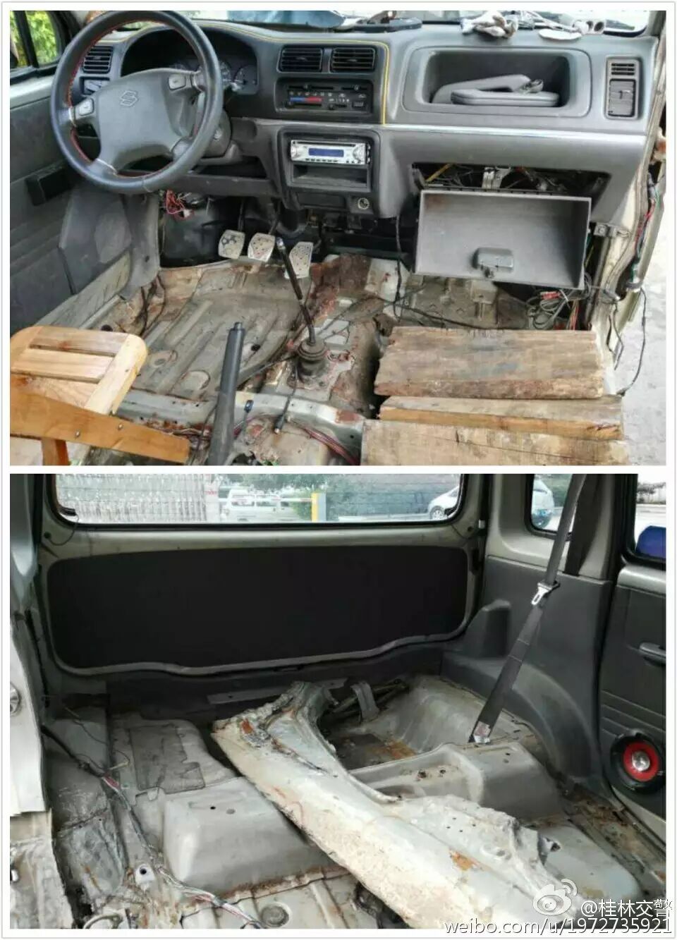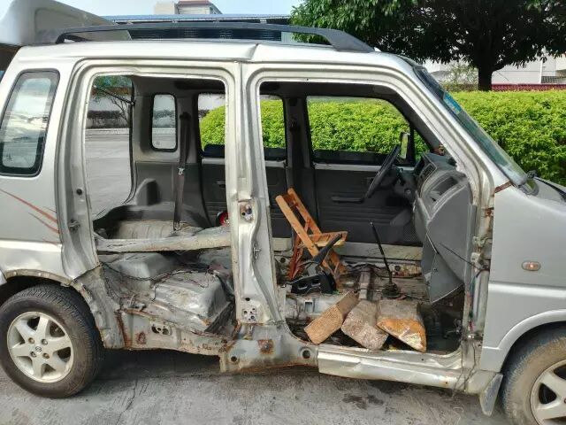 检查中发现,该车辆右侧的两扇车门都消失了,室内也被拆光,连个座位都没有,车内零部件杂物散落,线路、电路线头裸露,驾驶室更是以小木凳代替......合计这车就一个“光杆司令”么!