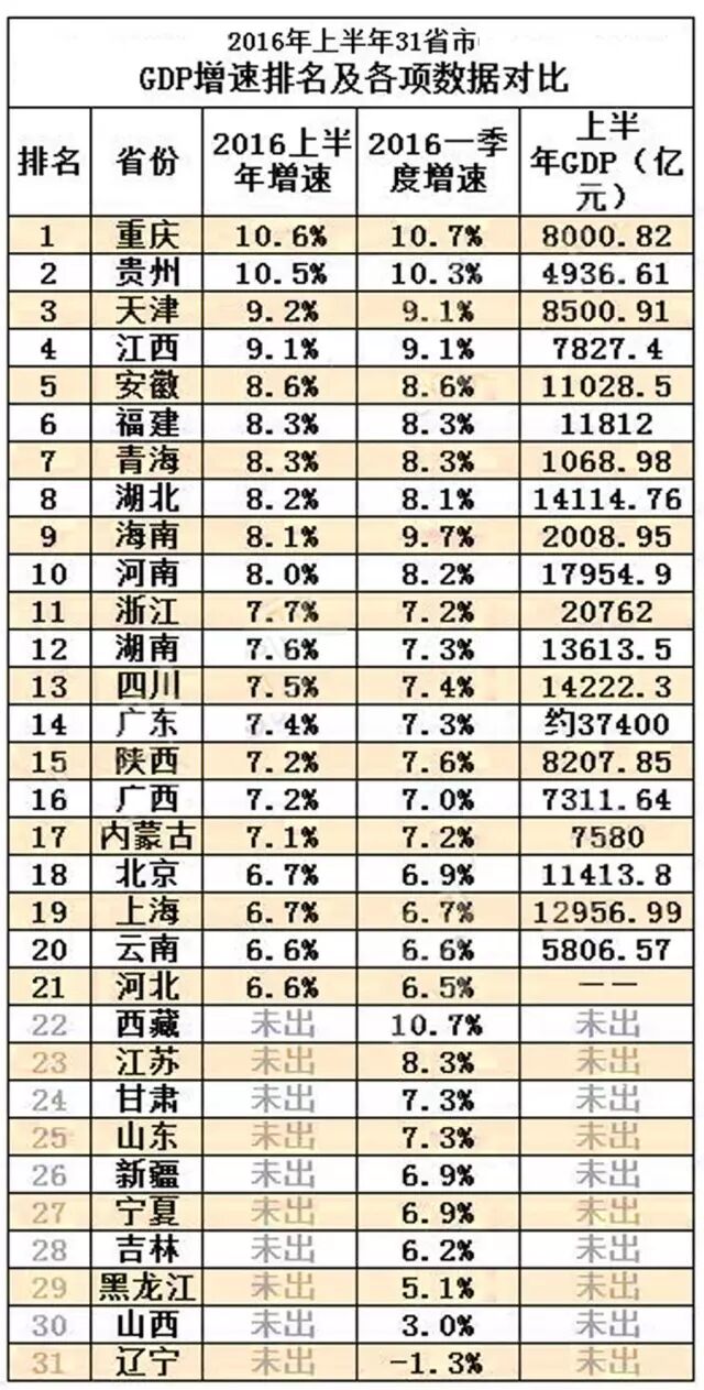 据统计,从表中可以看到,与一季度GDP增速相比,有重庆、海南、河南、陕西、内蒙古、北京6地上半年GDP增速有所下滑。江西、安徽、福建、青海、上海、云南6地的GDP增速与一季度持平。其它9个省份的GDP增速较一季度有所增长。