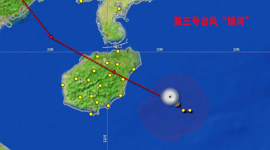 南海热带低压已于今天上午11时加强为今年第3号台风(热带风暴级),命名为“银河”,17时其中心位于我国海南省琼海市东偏南方向150公里南海北部海面上,就是北纬北纬18.6度、东经111.7度,中心附近最大风力有8级(18米/秒)(约 65 公里/时),中心最低气压998百帕。七级风圈半径东北方向90公里;东南方向100公里;西南方向120公里;西北方向90公里