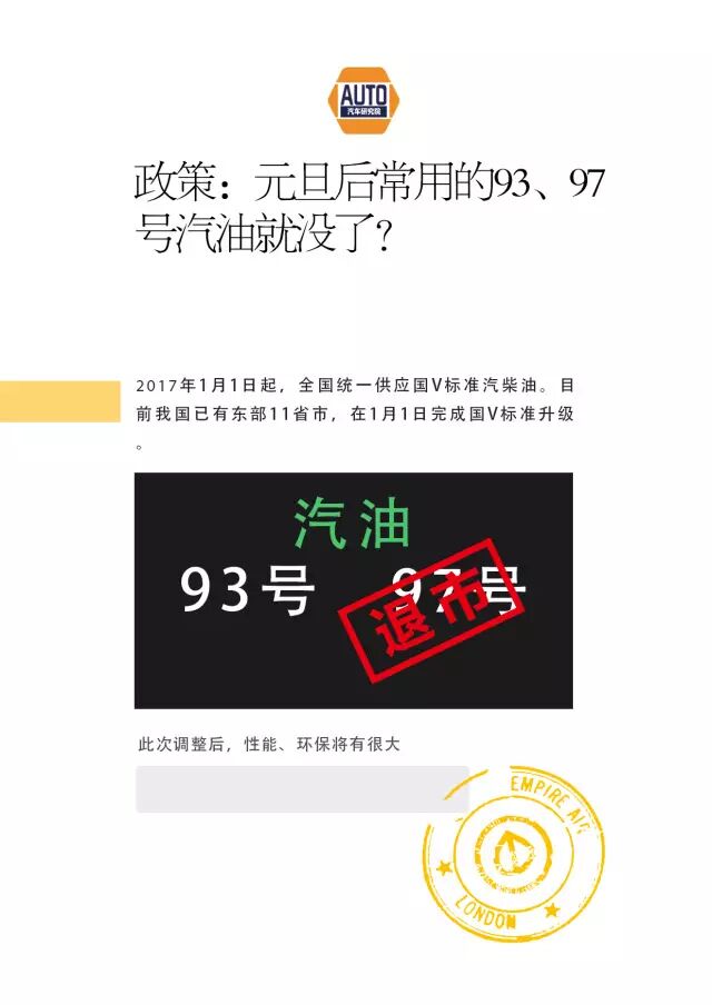 首页 | 美容百科 | 政策丨注意!元旦后常用的93、97号汽油不能加了! 政策丨注意!元旦后常用的93、97号汽油不能加了! 2023-04-19 23:50:29 点击上方“蓝字”立即加入汽车研究院不多说,直接仔细读政策汽研院你关心关注的,才是大事!具体表现为:国IV升级为国V后,汽油牌号由90号、93号、97号三个牌号调整为89号、92号、95号、98号四个牌号。当前,中国石化湖南石油分公司国IV车用汽油经营牌号为93号、97号,置换为国V车用汽油后分别对应经营牌号为92号、95号;同时为满足高端市场消费需求,拟在部分加油站供应质量更高的98号汽油。 此次升级后,柴油牌号不变,国V车用柴油经营牌号仍为0号。但是,之前加注97号国IV汽油的少数敏感车辆,如果选择加注95号国V汽油,还需一段适应期!主要是少数敏感车辆的发动机机械、电子设备、传感器已经适应了国VI油品,加注了国V油品初期,可能会出现高故障灯的现象。发生此现象的车辆去专业点人工消除“红灯警报”即可,消除后可继续使用国V油品,不会对车辆造成损害,汽车适应之后就不会在出现辆故障等的状况。中国石化湖南石油分公司也表示,力争将置换期缩短至3个月,确保在2016年12月31日前全面完成置换;2017年1月1日起,中国石化湖南石油分公司所有加油站(点)油品达到国Ⅴ标准车用汽、柴油质量标准。广西也印发了《进一步推进成品油质量升级实施方案》,明确从2017年1月1日起,全区全面停止销售低于国V标准车用汽油、柴油,进一步加强机动车尾气排放管理,以改善空气质量。那么问题来了?有车的小伙伴要怎么加油呢?加错了怎么办?油价会上涨吗?以后该加几号汽油?从93号转为92号油耗会增加?有研究表明,97号油换成95号后,油耗平均上升0.37%,即每辆车加60升油,相当于增加了0.2升,变化不明显。原使用93号油品的车辆切换成92号油品后,油耗较为接近无明显变化。与个人驾驶习惯、路况、车况等因素对油耗的影响相比,这些影响并不明显。价格会不会更贵?93号、97号汽油油价暂无变化。要不要先清洗油箱?不必特地清洗油箱。油箱里有93号、97号油,可以直接混加92号、95号油,第一次要耗油完毕再加油。加油四五次,就能完成“自然升级”。如果不小心加错油怎么办?分两种情况考虑:a、喝低标号油的车加了高标号油:通常一点事没有。b、喝高标号油的车加了低标号油:要看两个标号是否差别太大以及加的量。如果两个标号相差太大或者加了差不多整箱低标号油,建议车主放掉加错的汽油或者购买相关的燃油添加剂,以此来改善油品质量,减少低油品对发动机的伤害。这下,你了解了吗?喜欢别忘分享哦~