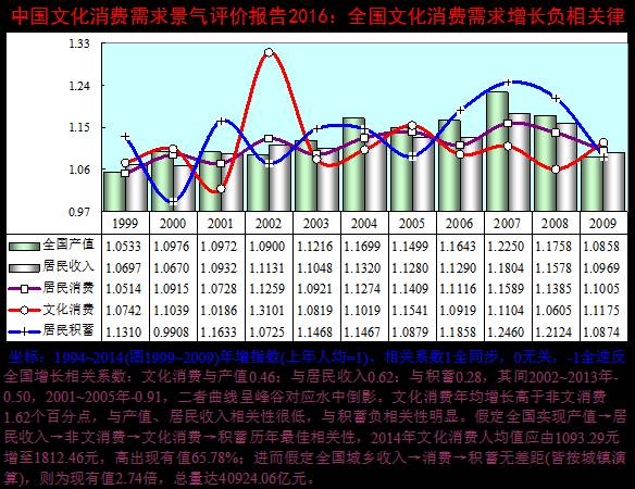 诚然,产值(“国民总收入”极度近似值)增长、居民收入增长都是文化消费增长的基础条件,亦为基本影响因素,但却不是直接影响因素。早在8年前,该书前期研究已发现并告学界,“人均产值超过3000美元必然带动文化消费剧增”的国际经验,“居民收入增长到高位自然拉动文化消费高涨”的生活常识都不灵验,我国城乡居民文化消费需求呈现“积蓄负相关律”,历年文化消费增长与积蓄增长两条曲线走势形成横向镜面对应反差,各年出现文化消费增长低谷必为积蓄增长高峰,反之亦反,全国如此,绝大部分省域也如此。将相应演算推导至尚待近期内国家统计局公布系统性数据的2015年,大部分省域依然如此,各地2014年文化消费高增长正是缘于同年积蓄低增长乃至负增长,这一“规律”势必继续延伸发生作用。