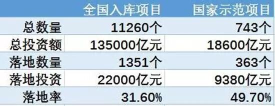 据季报,截至2016年12月末,全国入库项目共计11260个,总投资额13.5万亿元。其中,已签约落地的项目1351个,投资额2.2万亿元,落地率31.6%。国家示范项目743个,总投资额 1.86万亿元。其中,已签约落地的示范项目363个,投资额达9380亿元,落地率49.7%。第一、二、三批示范的落地率分别为100%、62.4%、42.9%。