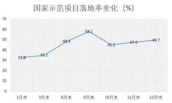 国家示范项目落地率变化虽然呈现起伏,1月到9月,示范项目落地率稳步提升,10月第三批示范项目数据纳入计算,故落地率有所下降,11月以来落地率又稳步提升。