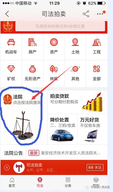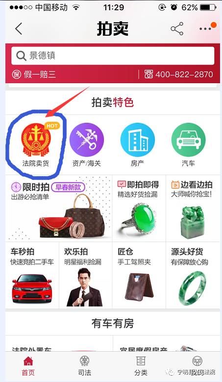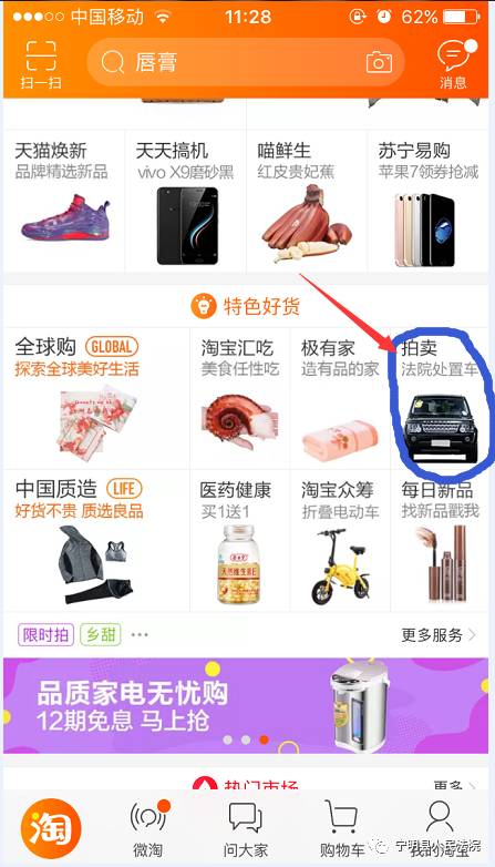打开淘宝,找到“拍卖”,如下图箭头所示!