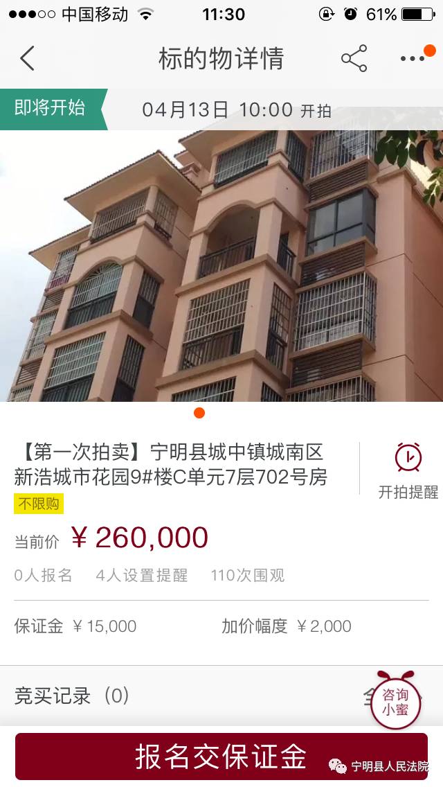 传统的拍卖方式存在耗时久,变现难的问题,严重影响了司法效率,,切实解决执行难的又一创新举措。、韦某所有的一套位于宁明县城新浩城市花园9#C单元702号在淘宝网进行拍卖,实挂出当天,便引来120多次围观,已有4人设置了开拍提醒,凸显了网络司法拍卖传播速度快、覆盖面广、操作便捷的特点。