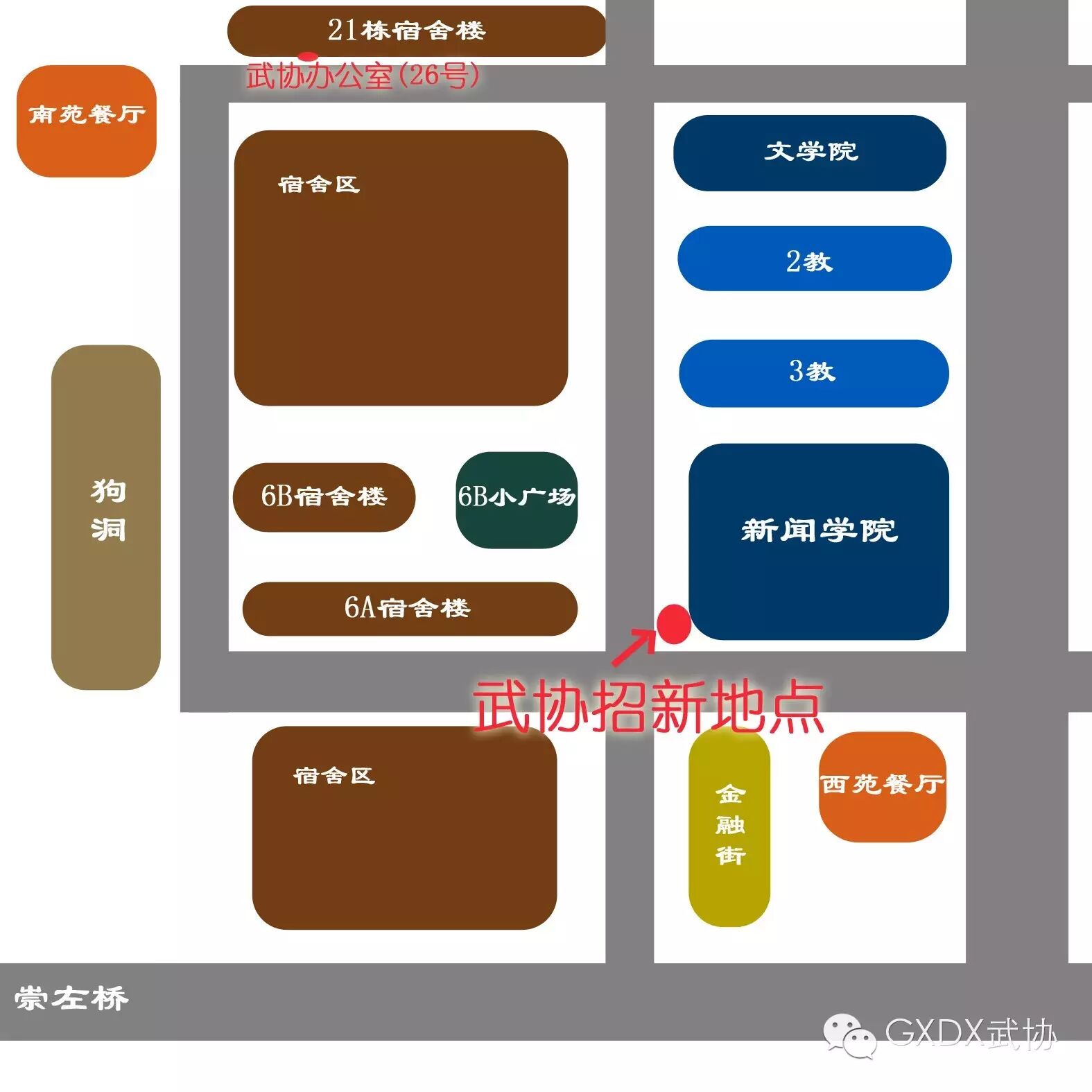 #武协招新#就是今天,2015年广西大学学生武术协会招新已经开始了!!!~~~ 今天和明天22、23日两天,我们武协的小伙伴将在西校园招新了,具体地点在新闻楼靠近金融街转弯处(详见图)。24小时欢迎想了解武术,喜爱武术、热爱武术的同学们~~~~