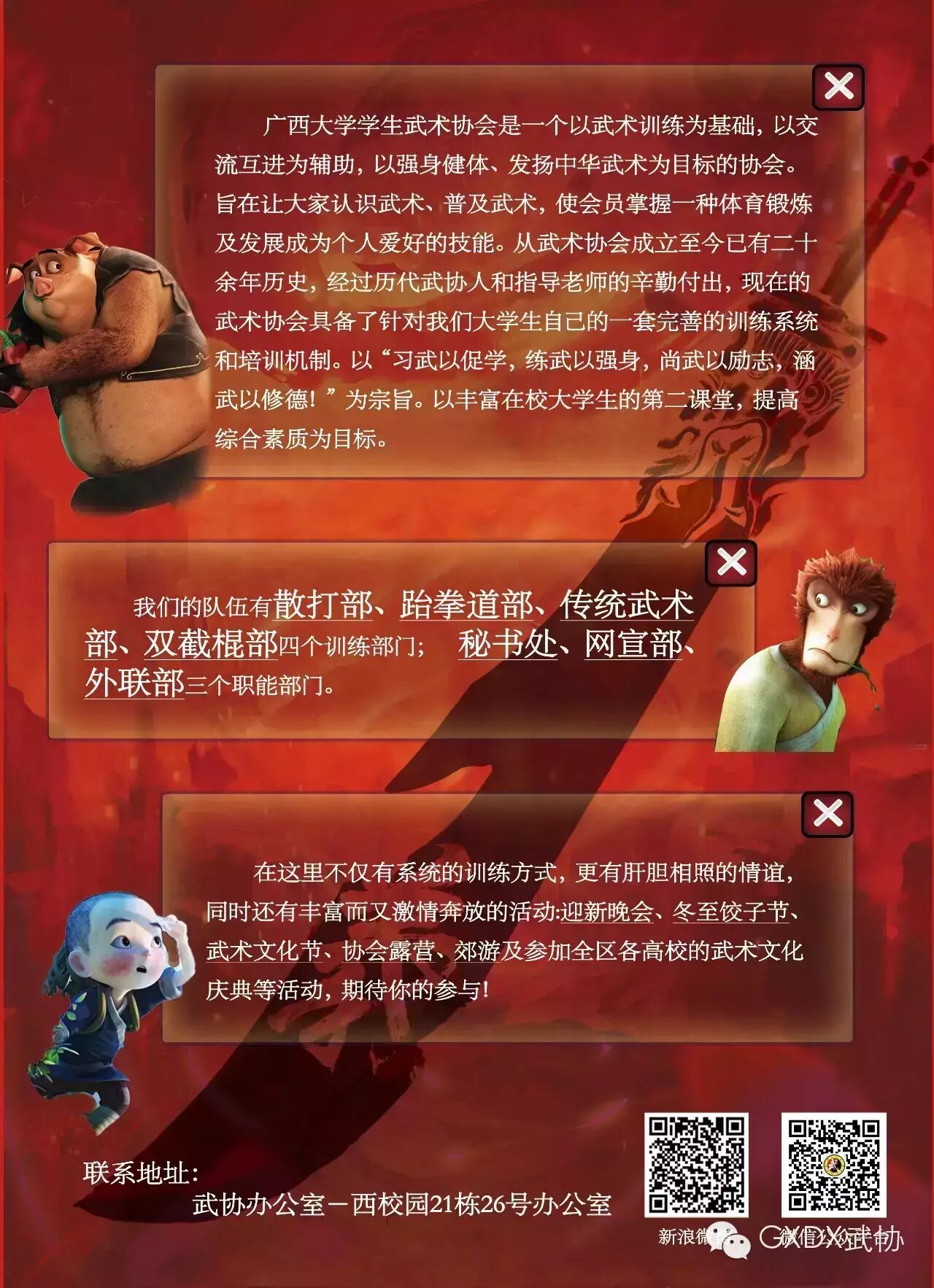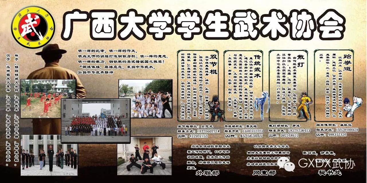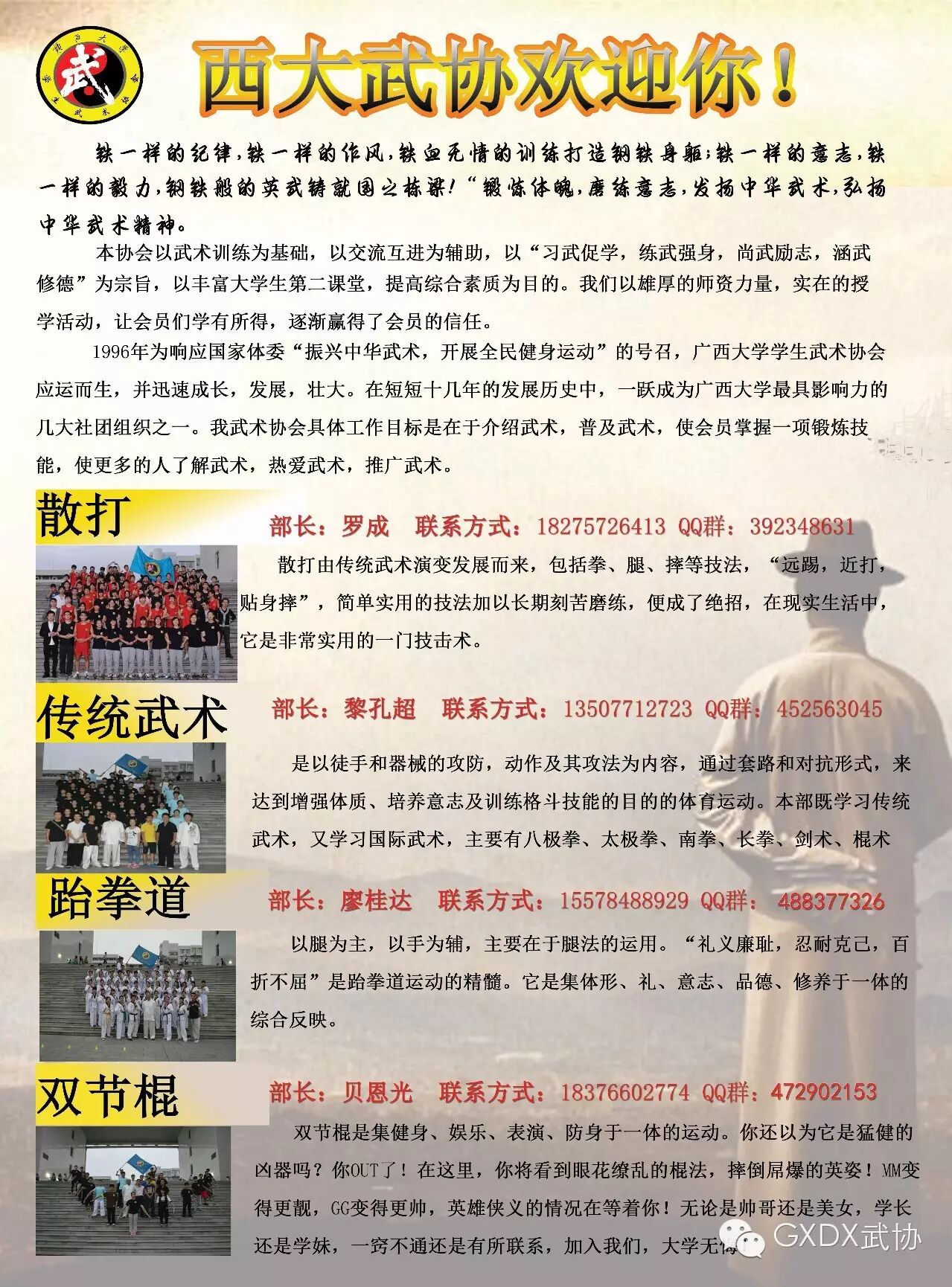 我们有散打,传统武术,跆拳道,双截棍四个训练部门,秘书处 网宣部,外联部三个职能部门。 QQ群:486993711 招新时间: 9月22、23日6b小广场新闻楼附近 24、25日碧湖苑。 我们在这里等你。