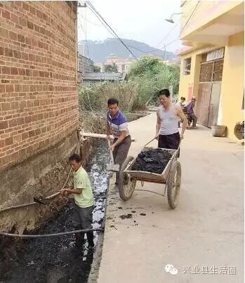 邹项(左二)与村干部一起清理村中水沟。