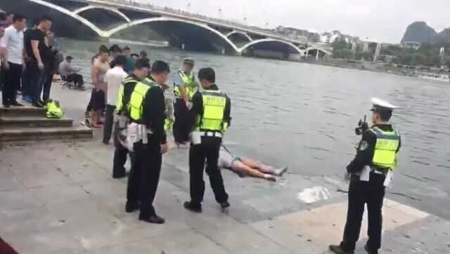 交警立马上前查看情况,看见男子的的摩托车上绑了很多个电单车电瓶。冲卡男子见交警过来,便撒腿向漓江边跑去,跳进了河里。