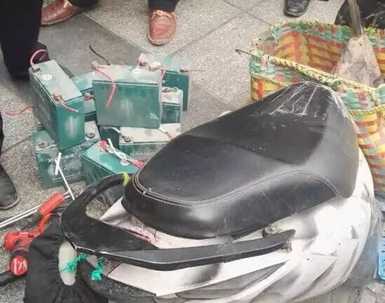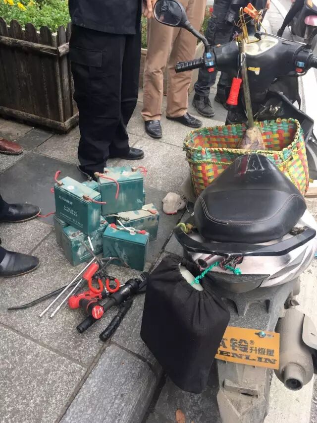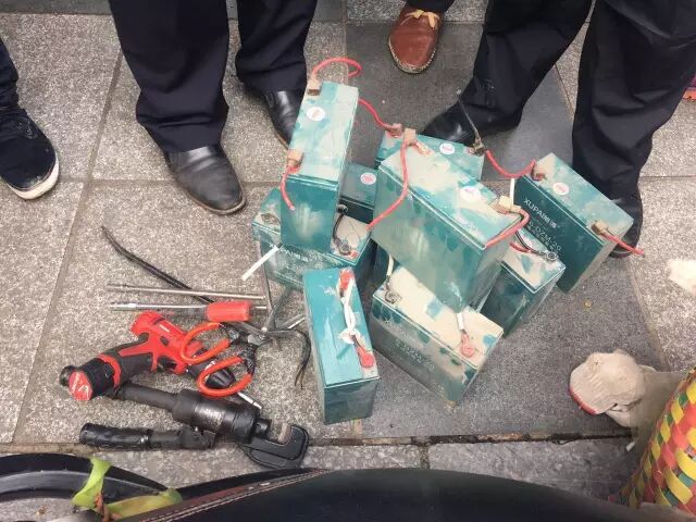 ▲ 民警从男子驾驶的摩托车上发现许多电动车电瓶及疑似作案工具