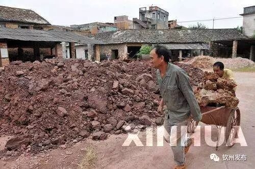 ▲钦州市的一家小作坊员工正在运送日益紧缺的陶土