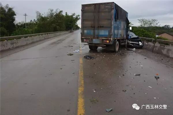 3月25日早上8时50分左右,在玉博公路沙田路段发生一起交通事故,一辆厢式轻型货车与一辆黑色轿车迎面相撞,造成轿车上两人受伤的交通事故。据货车司机宋某交代:驾车至事发路段时,看到前面有一小坑,司机想避开,于是马上踩刹车,但由于雨天路滑,车辆就打滑失控跨过单实线驶向对向车道后,碰到旁边的大桥护栏,正在此时对向恰好驶来一辆黑色轿车,货车司机宋某赶忙往右打方向要避开对向轿车,而轿车司机见到前面猛然出现一辆小货车后也紧急往左打方向避让,两车不偏不倚正好撞上。