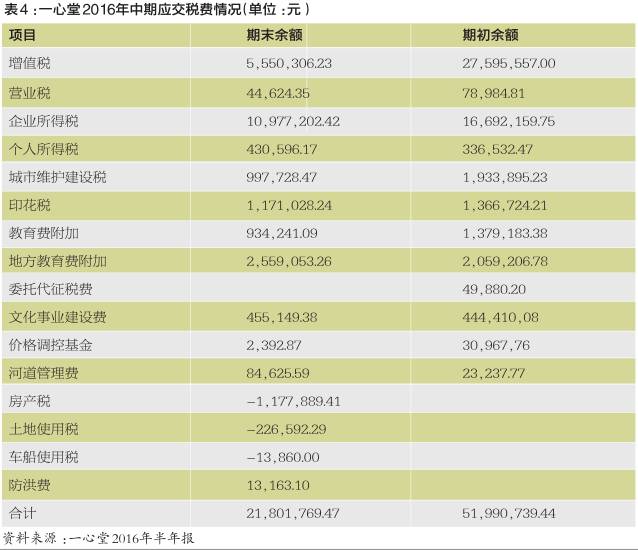 再来看一心堂,其2016年上半年营业收入295175.07万元,较上年同期的249906.92万元上涨18.11%;归属于上市公司股东的净利润为19634.17万元,同比提升12.85%。这两个指标的绝对值都强于益丰大药房,但从当期缴纳的企业所得税来看,其在上年1991.82万元的基础上提升18.46%,达到2359.43万元,但仍远低于益丰大药房的3804.75万元。按前文的税负公式计算,一心堂的税负为10.73%,同样远低于益丰大药房的25.34%。