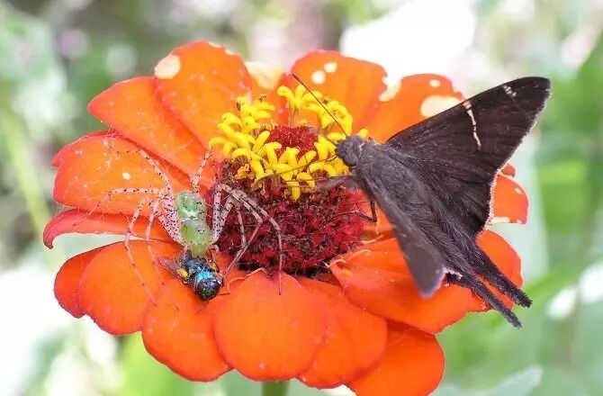 2. 一朵花上蜘蛛正在捕食一只蜂,蝴蝶在一边吸食花蜜。