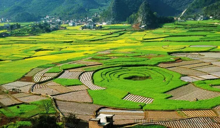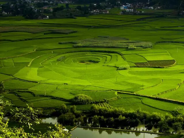 如果这样的地貌还不足令你感到奇特的话,那再看看这农田的形状吧。这里的田块形态万千,平而不整,直线、斜线、弧线、曲线、圆线一应俱全。