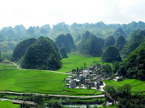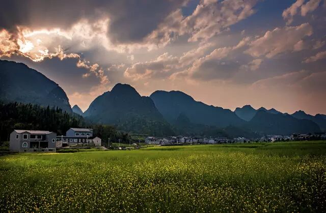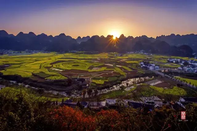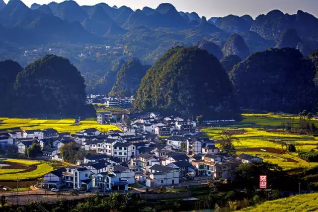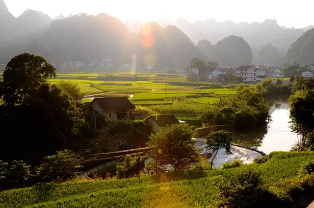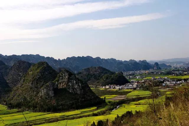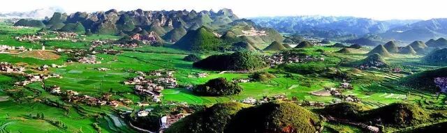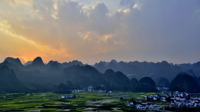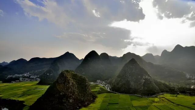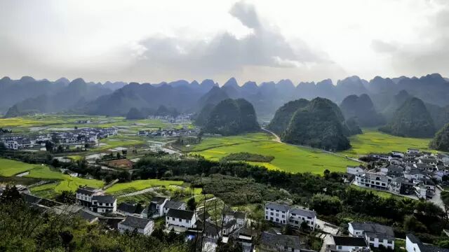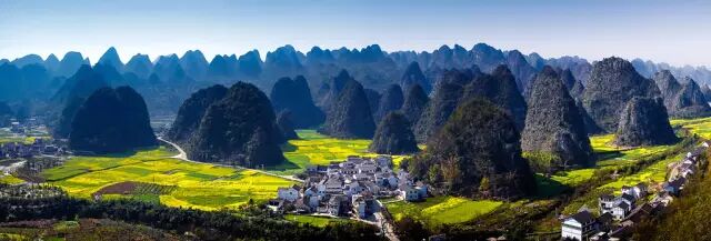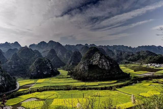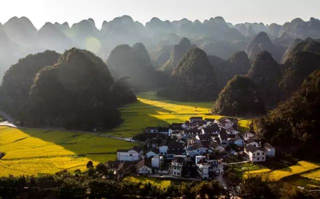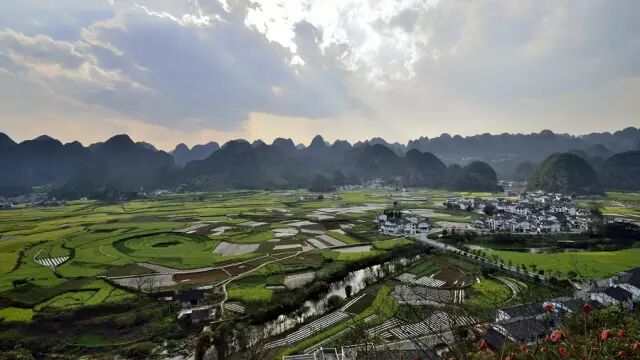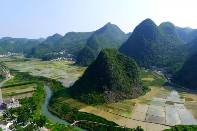 万峰林的山与河与村完美的组合让人晕眩,对摄影发烧友来说无疑是天堂。登高远望,青灰色的秀峰似林,黄绿相间的田野成片,村庄坐落其中,小河弯曲延伸,一幅瑰丽绝美的山水画卷呈现眼前。