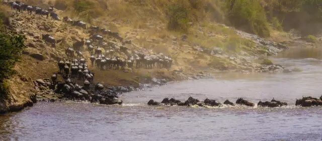 如果真的存在规模盛大的野生动物表演秀,那就非角马大迁徙莫属。每年从7月到10月,有超过150万头的角马和斑马为了鲜嫩的牧草而前往马赛马拉。浩浩荡荡的角马群如潮水一般,渡过鳄鱼出没的河流,爬上河岸,而作为机会主义者的狮子一直在旁虎视眈眈。欣赏这一壮观场景的最好方法就是骑马。为什么?因为野生动物不怕马,这让你有机会与自然奇观近距离地接触。角马迁徙期间,你可以在一旁策马奔腾,也可以真正深入荒原,进入双脚或者吉普车无法到达的偏僻区域。