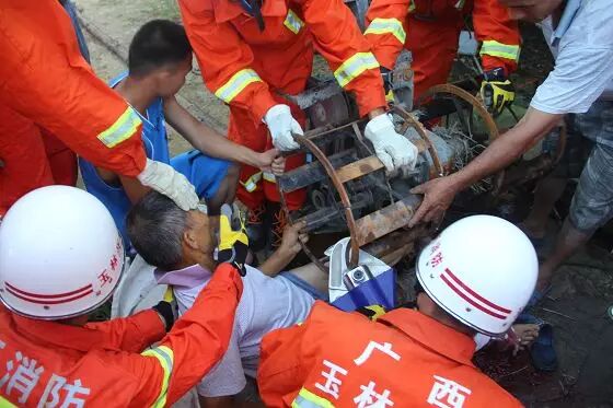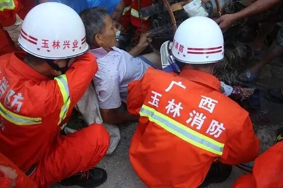 7月27日6时26分,广西玉林市兴业县石南镇新村一老人在维修小型收割机时,由于操作不当,导致左脚被卡在农用收割机车轮内。接到报警后,兴业消防中队官兵火速赶赴现场处置。