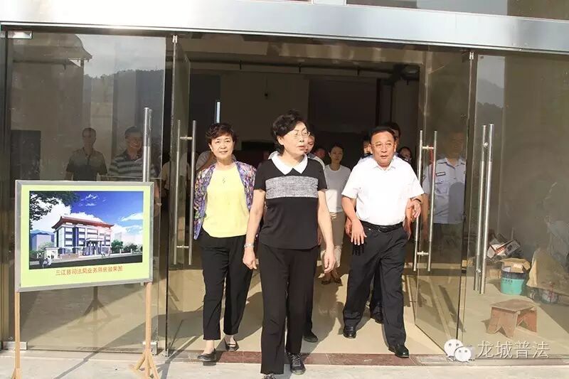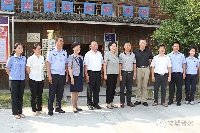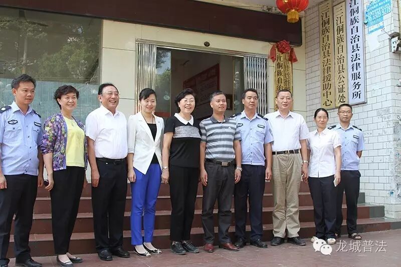 中国法律援助基金会会长张彦珍、自治区司法厅厅长赵波、柳州市副市长刘海等与三江县丹州司法所干警合影