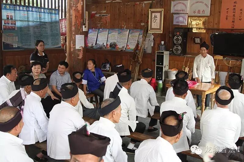 调研组实地考察三江县程阳八寨法治文化教育基地,观摩侗族寨佬在鼓楼内进行法律“讲款”