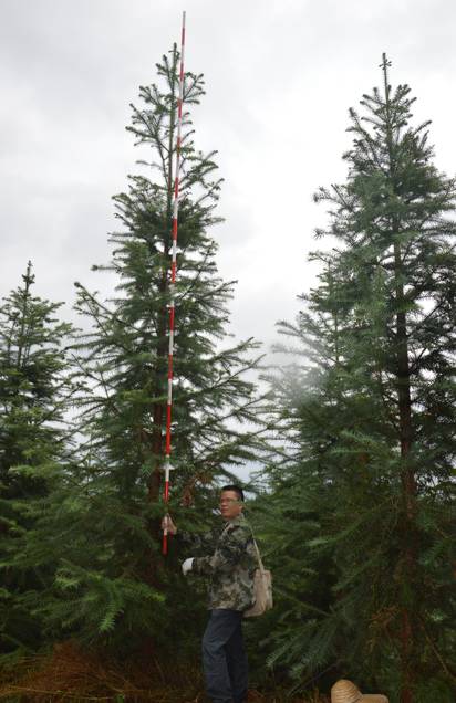 2016年10月,林网君跟随广西华沃特肥业公司副总经理林海能、广西林科院唐健博士、覃其云高级工程师以及华沃特公司区域经理一同前往林朵林场巴雍分场调研杉木高产示范林,其长势十分良好:仅2年多时间,杉木平均树高5米以上,胸径10公分左右,叶色浓绿,节间距长,顶端优势明显,塔型旺势显著,冠幅大……