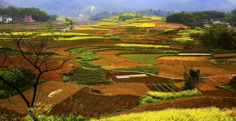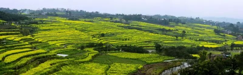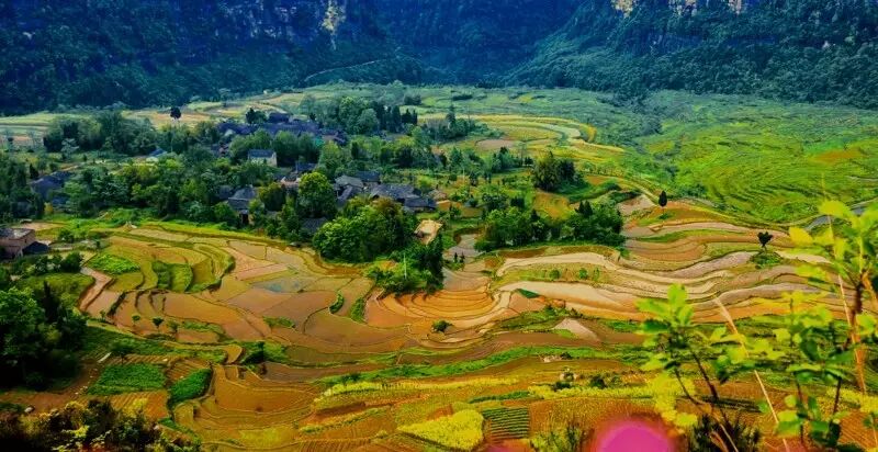 当梯田和油菜花相遇,一片金光灿烂,错落有致,远处眺望,美不胜收。