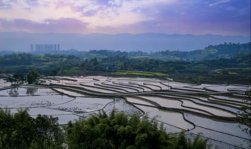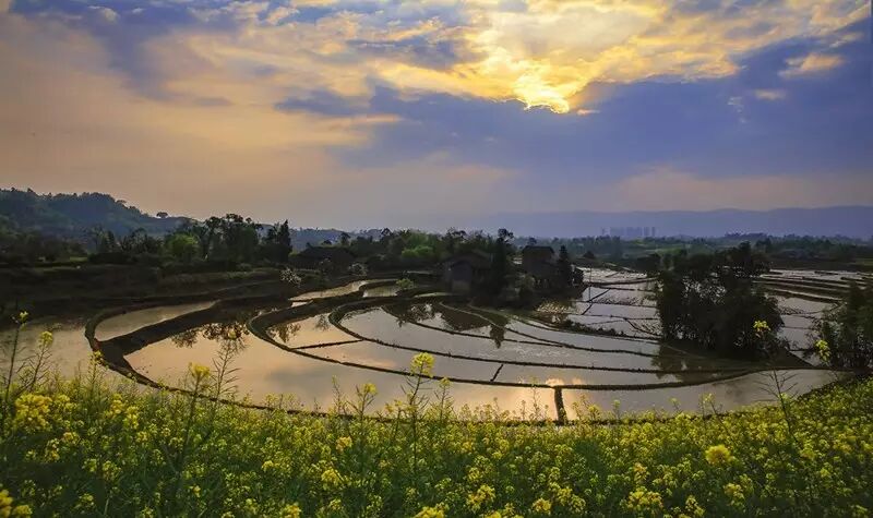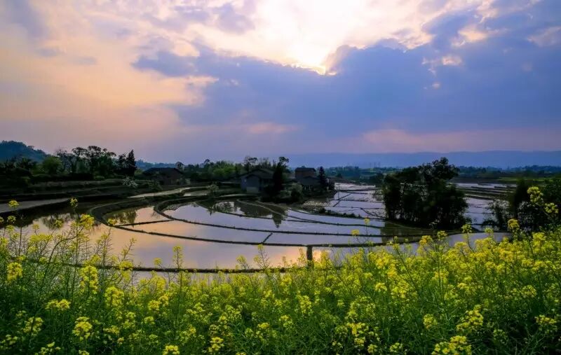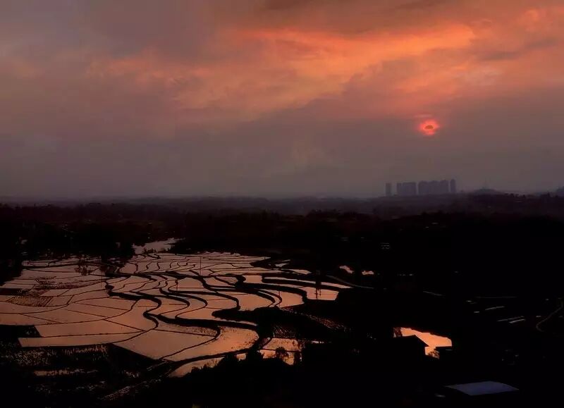 夕阳西下,梯田在余晖中散发着柔美的红光。四周的颜色也随着不断变幻,那份恬静与浪漫,让人陶醉。